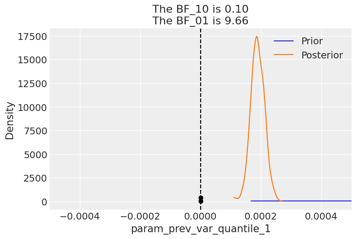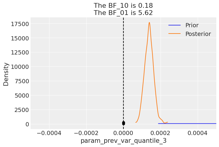 posterior_samples = mcmc.get_samples()predictive = Predictive( garch_like_model, posterior_samples=posterior_samples, return_sites=["log_ret"], # or whatever your observation site is called)rng_key, rng_key_ppc = random.split(rng_key)ppc_samples = predictive( rng_key_ppc, present_value=present_value_train, past_values=past_values_train)prior_samples = Predictive(garch_like_model, num_samples=2000)( rng_key, present_value=present_value_train, past_values=past_values_train,)idata = az.from_numpyro(mcmc, posterior_predictive=ppc_samples, prior=prior_samples)for k in posterior_samples.keys(): az.plot_bf(idata, var_name=k) plt.gca().set_xlim([-0.0005, 0.0005])