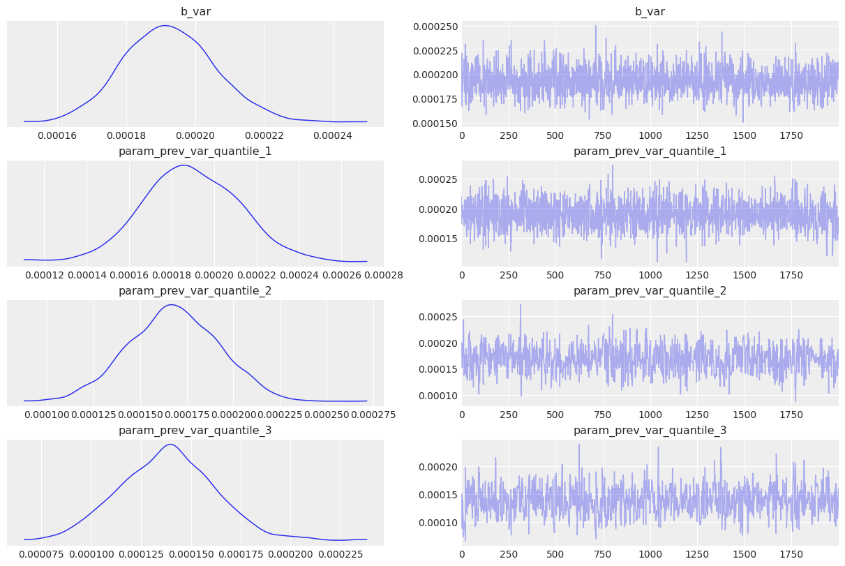 The model seems to be converging well(notice the \(\hat{r}\)). Now let’s explore basic diagnostics for the model. Starting with the forest plot of the posterior. I can immediately notice two interesting things: both biases for log return and variance are 0. Also, all variance terms except for the previous one are essentially 0 too, meaning that only the variance of the previous 3 days is important. We might very well have selected a bad time frame and we need to experiment with shorter/longer variance aggregation time frames. There is a need to study volatility clustering patterns somehow.