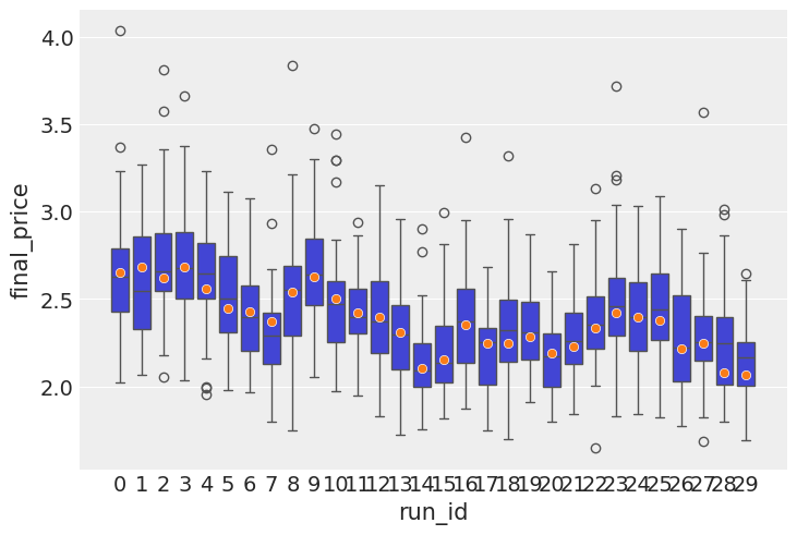 I now turn my attention to testing the predictive power of the model. Posterior checks are good and fun, but the model is autoregressive in nature, so what needs to happen is we need to roll through out test set, simulate a distribution of forward looking prices, then do boxplots, with the predicted price distributions and the actual price inside those boxes. The purpose of this exercise is to see if the actual price tends to be within the range of prices that comes out of simulations.