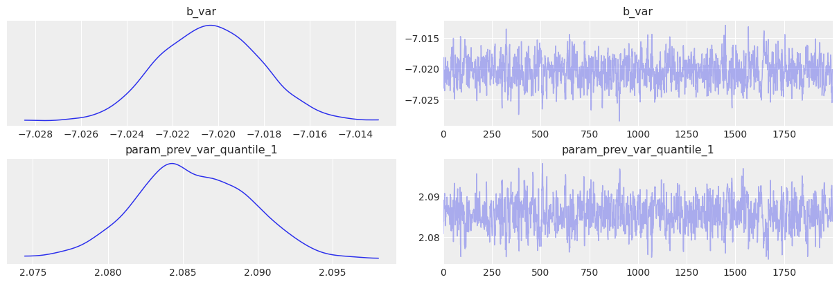 idata = az.from_numpyro(mcmc, posterior_predictive=ppc_samples, prior=prior_samples)az.plot_trace(idata, var_names=["~^log_ret_var"], filter_vars="regex");