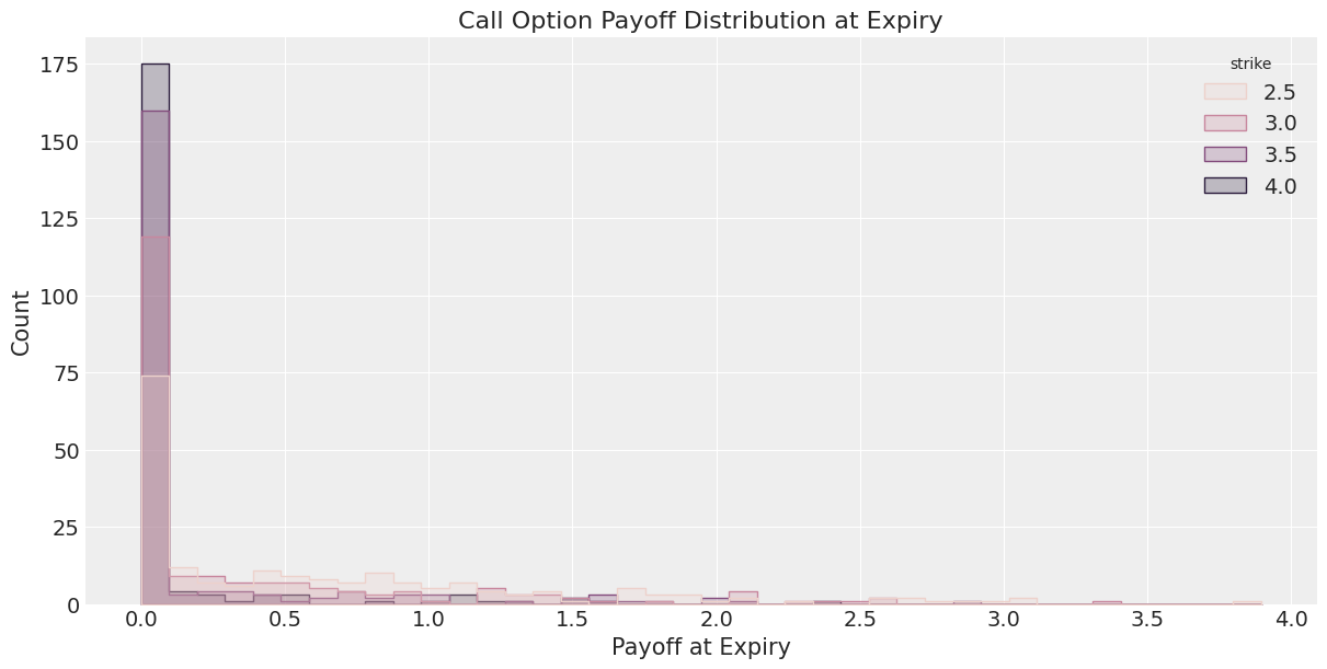 Next, we calculate the call option payoff distributions, as well as model-implied option prices.