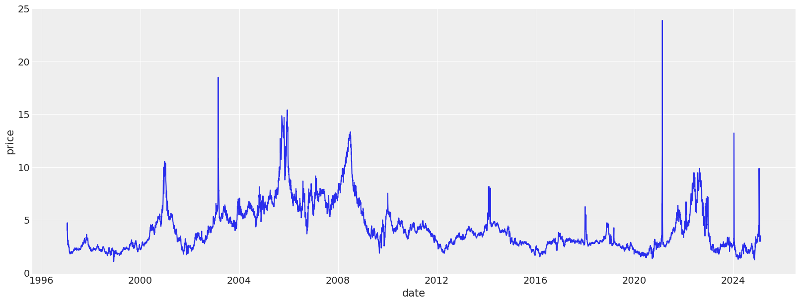 df_with_features.head()| date | price | ret | log_ret | var | log_var | var_quantile | prev_log_ret_1 | prev_log_ret_2 | prev_log_ret_3 | prev_var_1 | prev_var_2 | prev_var_3 | prev_var_quantile_1 |
